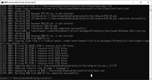 輸入pyinstaller -F main.py,規則是pyinstaller -F [你要打包的py檔名稱]