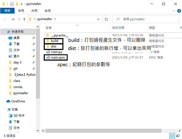 .spec:紀錄打包參數等等,可以想成安裝預設檔案,也可以用來打包,pyinstaller -F main.spec