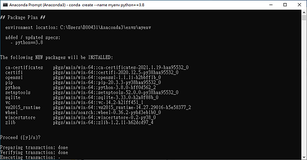 使用 conda create --name myenv python=3.8.5來創建新環境