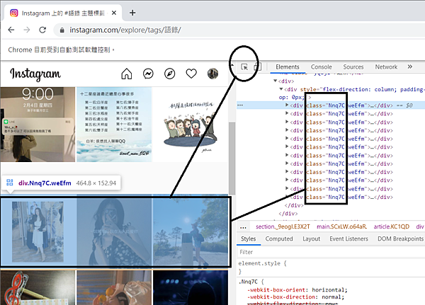 意思我們可以藉由找這class找到貼文位置,他會返回這網頁所有使用Nnq7C的地方裝在一個list裡面。