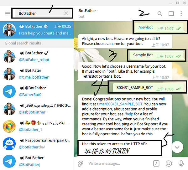 這部份很簡單,在telegram中找到BotFather並跟他申請一個機器人,取得你機器人的token。