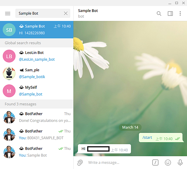 如此一來我們只要輸入/start 機器人就會回答HI + 發送訊息群組或個人的ID。
