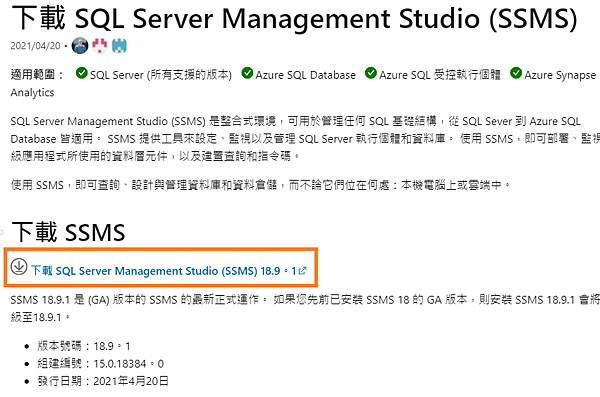 2. 安裝SQL Server Management Studio(SSMS):SSMS 提供工具來設定、監視以及管理 SQL Server 執行個體和資料庫。