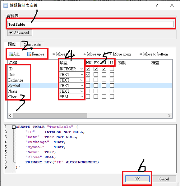 3.這邊新增6個欄位名稱分別為ID、Date、Exchange、Symbol、Name、Close