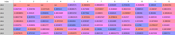如此一來就能一目了然的知道哪年哪月有著最好的報酬,同時也能進行季節性分析。