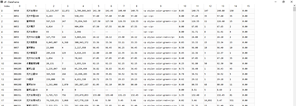 import pandas, numpy import requests import json import random # 日期 date = datetime.datetime(2021,9,15) # 抓取20210915日的資料 date_f = date.strftime('%Y%m%d') # 格式化日期 # 目標網址 url = 'https://www.twse.com.tw/exchangeReport/MI_INDEX?response=json&date=' + date_f + '&type=ALLBUT0999&_=1620615911060' # 爬蟲 Agent = random.choice([1,2,3,4,5,6,7,8,9]) headers = {'User-Agent': 'Mozilla/' + str(Agent) + '.0'} # 要求的header # 請求資料 re = requests.get(url, headers=headers) data = json.loads(re.text) # 取得目標資料 df = pandas.DataFrame(data['data9']) print(df)