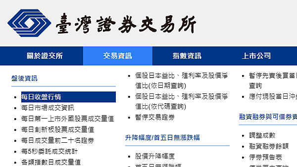 前往證交所網站https://www.twse.com.tw/zh/,而後至每日收盤行情。