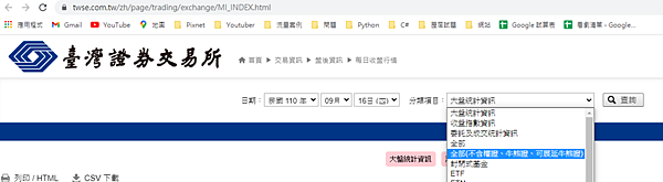 想要台股每日行情嗎!證交所告訴你(https://www.twse.com.tw/zh/page/trading/exchange/MI_INDEX.html)