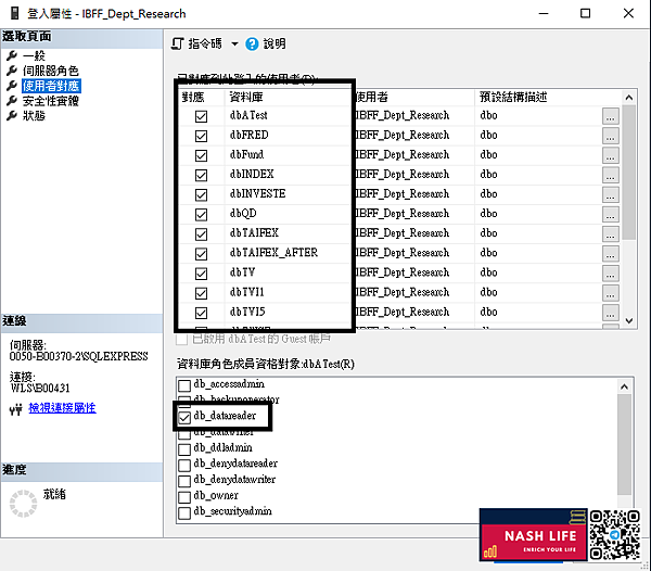 在這個地方就可以決定該帳號可以登入的資料庫,與該帳號的角色,也是是權限的部分。